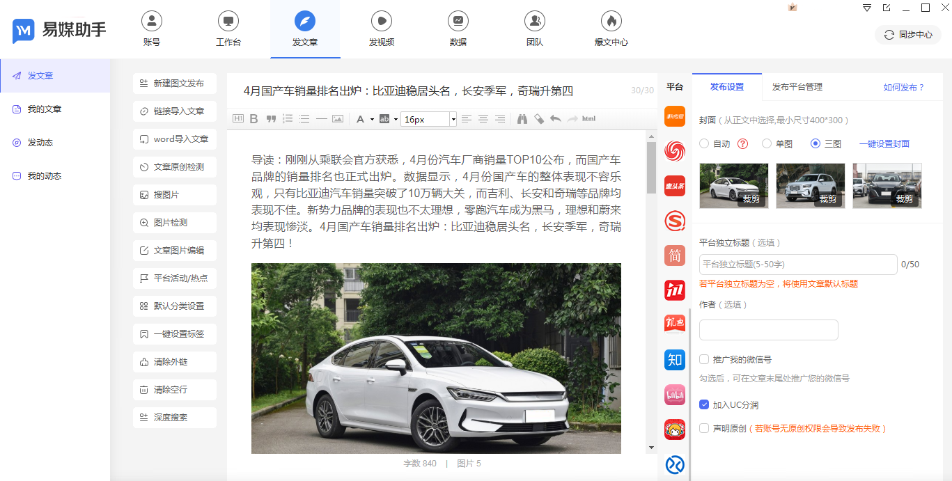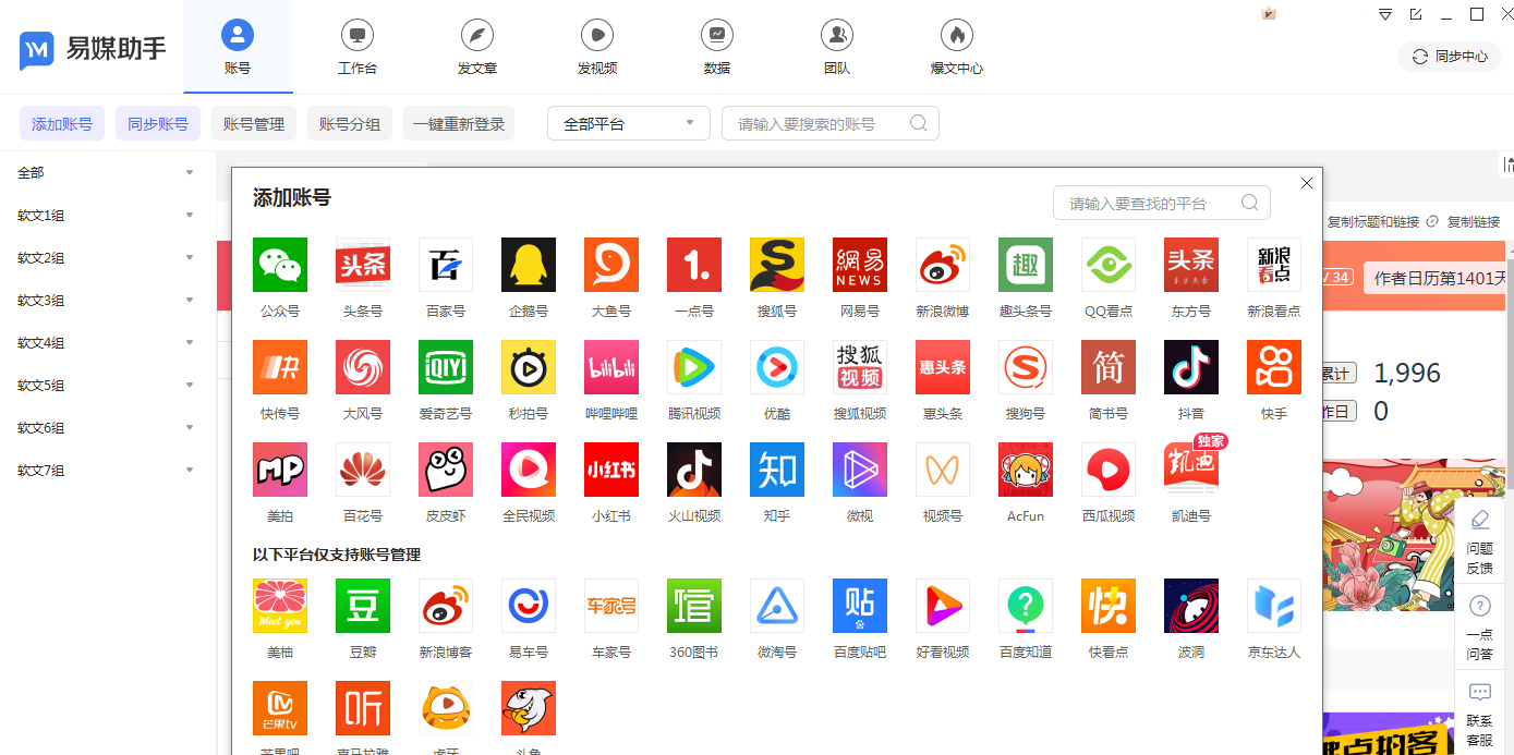 易媒支持一鍵登錄和多平臺(tái)分發(fā),助力自媒體人高效管理多賬號(hào),提升內(nèi)容創(chuàng)作水平。