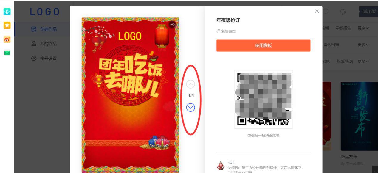 打開模板后,點擊箭頭可以預覽頁面內容,右邊的二維碼可以在手機上預覽,更加直觀。點擊【使用模板】開始編輯。